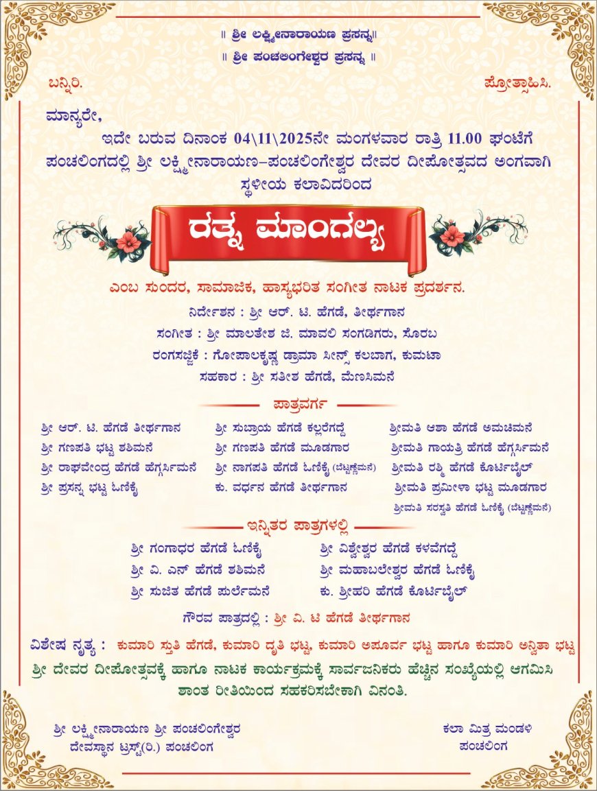 ಶಿರಸಿ ತಾಲೂಕ ಶಿವಳ್ಳಿ ಸೀಮೆಯ ಪಂಚಲಿಂಗದಲ್ಲಿ ನವಂಬರ 4, 2025 ಮಂಗಳವಾರದಂದು ಲಕ್ಷ್ಮಿನಾರಾಯಣ ಶ್ರೀ ಪಂಚಲಿಂಗೇಶ್ವರ ದೇವರ ದೀಪೋತ್ಸವದ ನಿಮಿತ್ತ ರಾತ್ರಿ ೧೧.೦೦ ಘಂಟೆಗೆ ಸ್ಥಳೀಯ ಕಲಾವಿದರಿಂದ ‘ರತ್ನ ಮಾಂಗಲ್ಯ’ ಎಂಬ ಸಾಮಾಜಿಕ ನಾಟಕ ಪ್ರದರ್ಶನಗೊಳ್ಳಲಿದೆ.